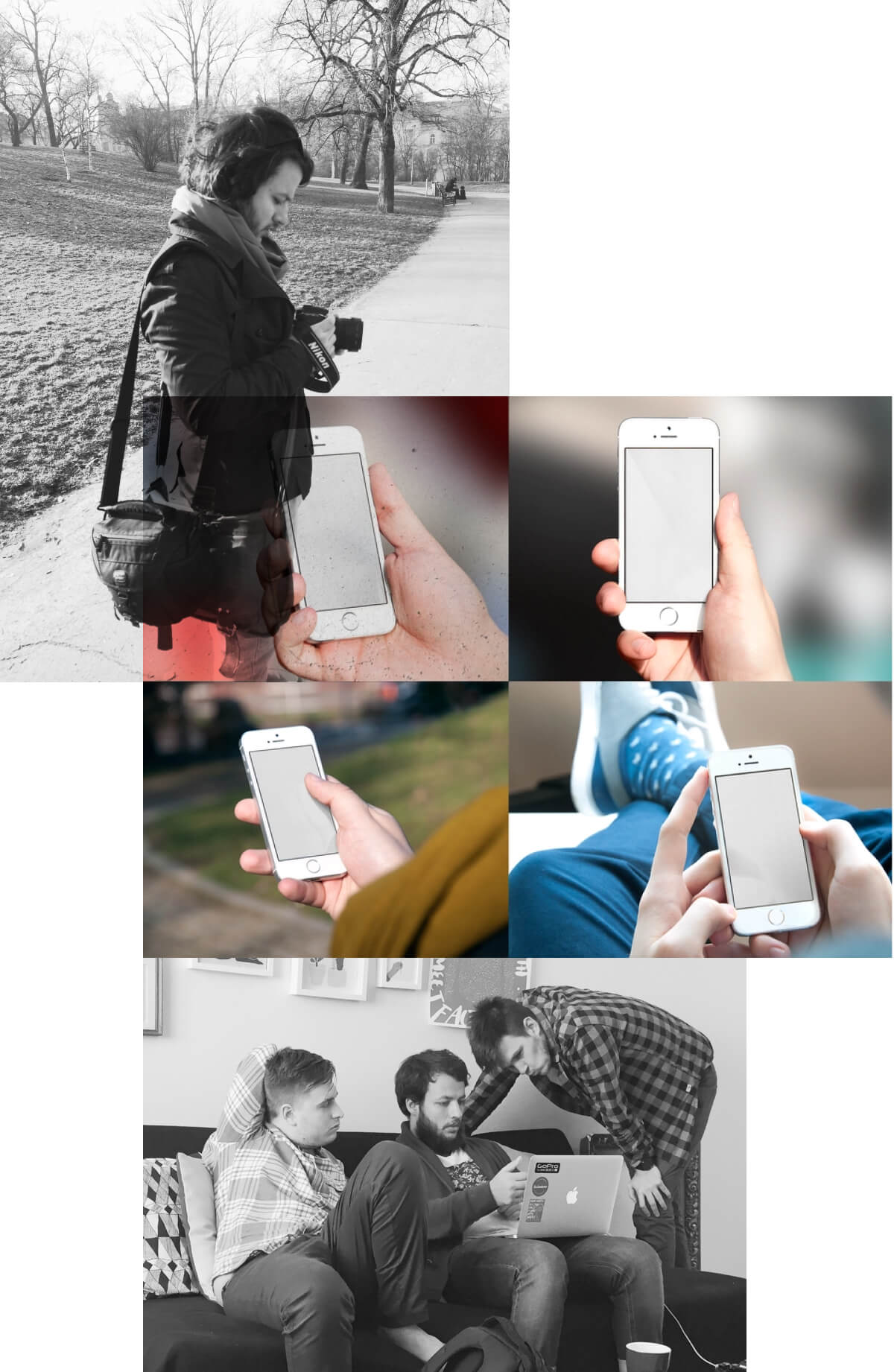 One day we decided enough was enough. We grabbed a DSLR camera, headed to the park opposite the office, and snapped pictures of ourselves holding phones to create our own scenes.