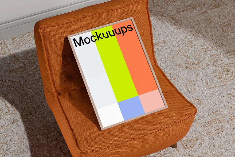 This mockup features an A3-sized frame resting on a modern orange fabric chair. The chair is placed on a textured beige carpet, creating a cozy and stylish setting. The natural lighting adds subtle shadows, highlighting the vibrant color of the chair and the clean lines of the frame. Perfect for showcasing artwork, posters, or branding materials, this mockup offers a simple yet elegant presentation for your designs.