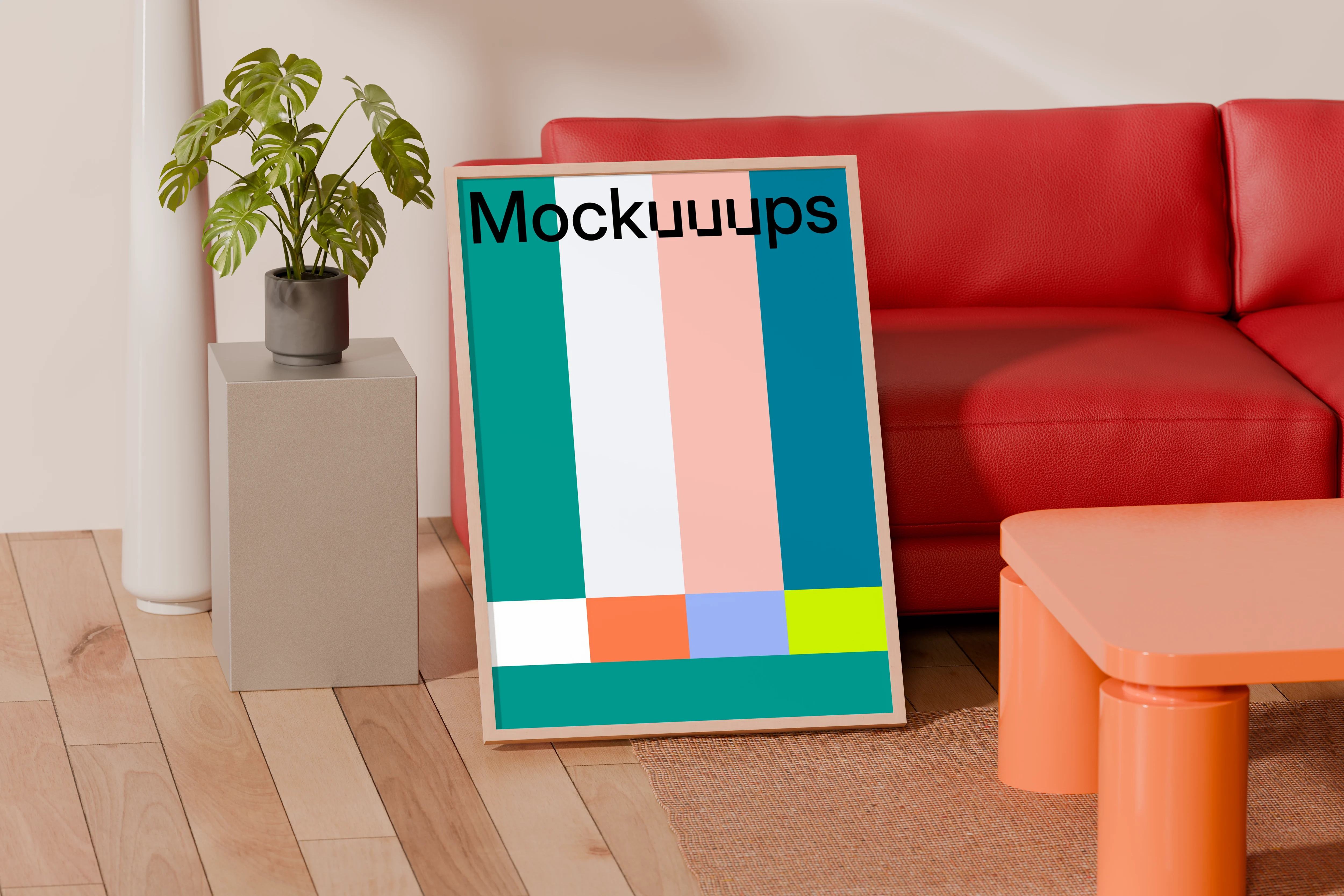 This mockup showcases an A3-sized frame resting on the floor in a sleek and vibrant interior. The frame leans against a bright red couch, with a modern orange coffee table on the right and a potted plant placed on a small pedestal nearby. The wooden flooring and soft lighting create a stylish and warm atmosphere, making it a perfect choice to display your graphic designs or artwork in a contemporary setting.