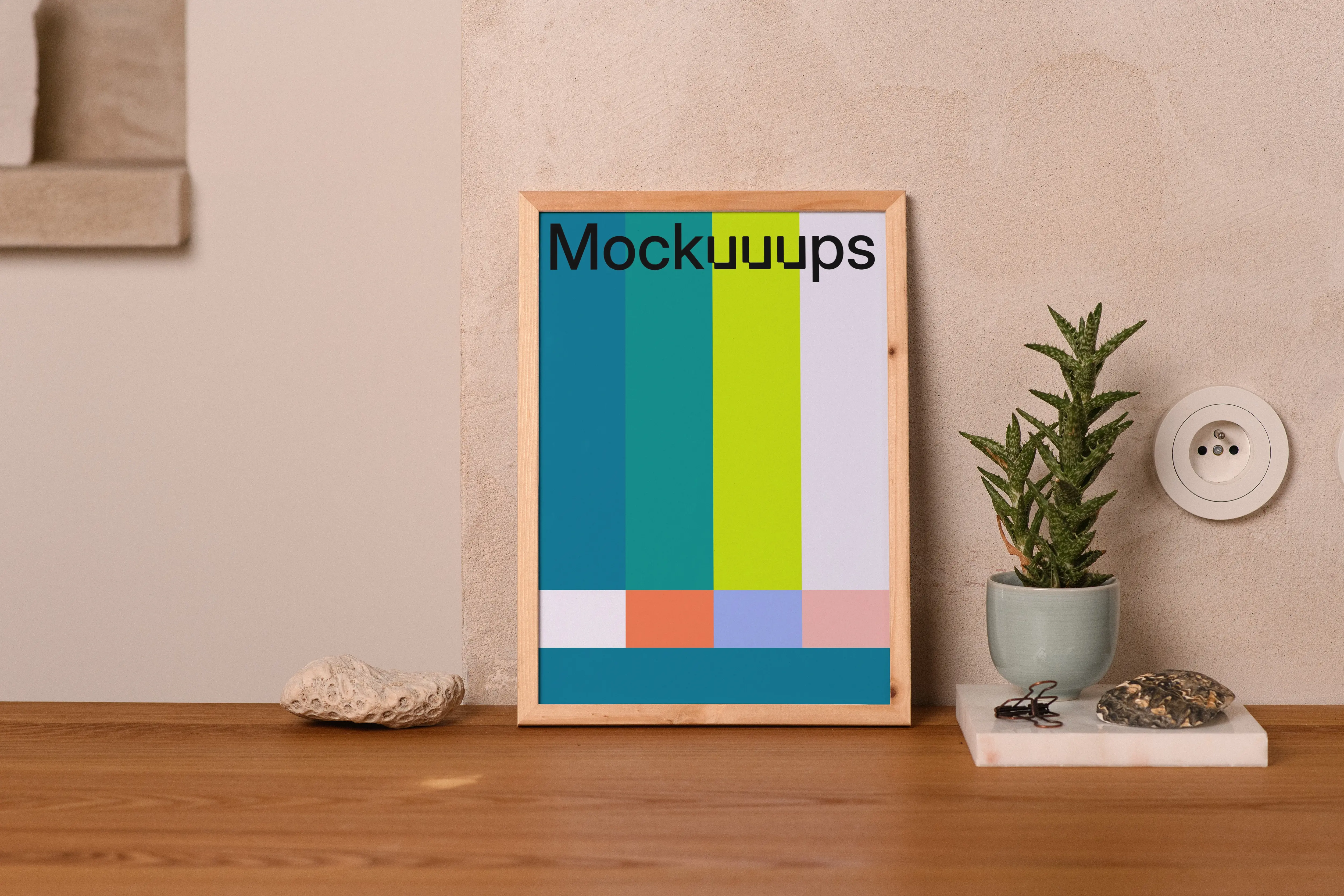 A visually pleasing A4 mockup featuring a minimalist wooden frame resting on a wooden tabletop against a neutral stone-textured wall. The composition includes a potted succulent sitting on a white marble base, a decorative stone, and a natural sponge, adding organic elements to the scene. This mockup is ideal for showcasing poster designs, print materials, or artwork in a clean and modern aesthetic. Perfect for use in design presentations, portfolios, or online storefronts.
