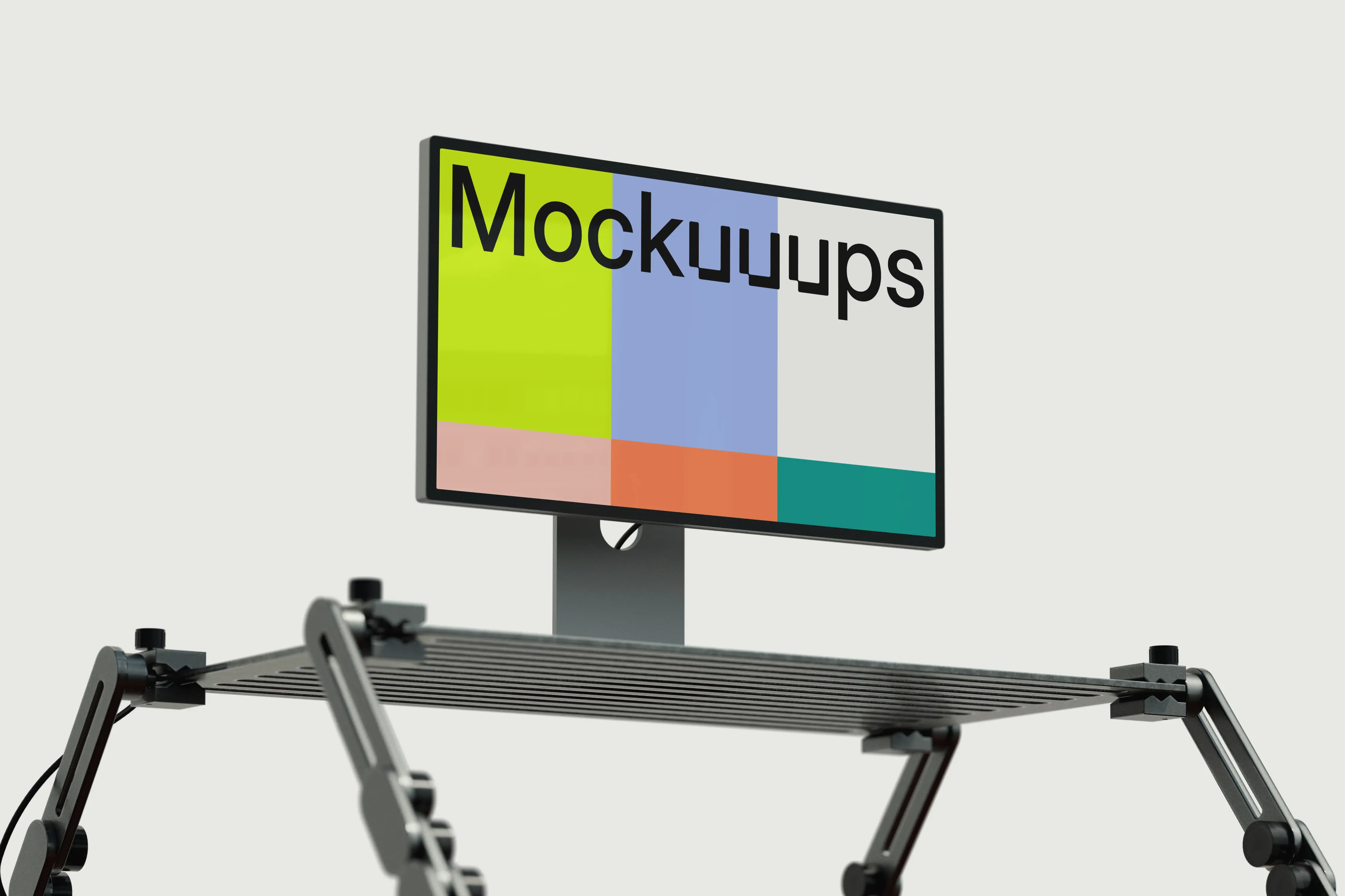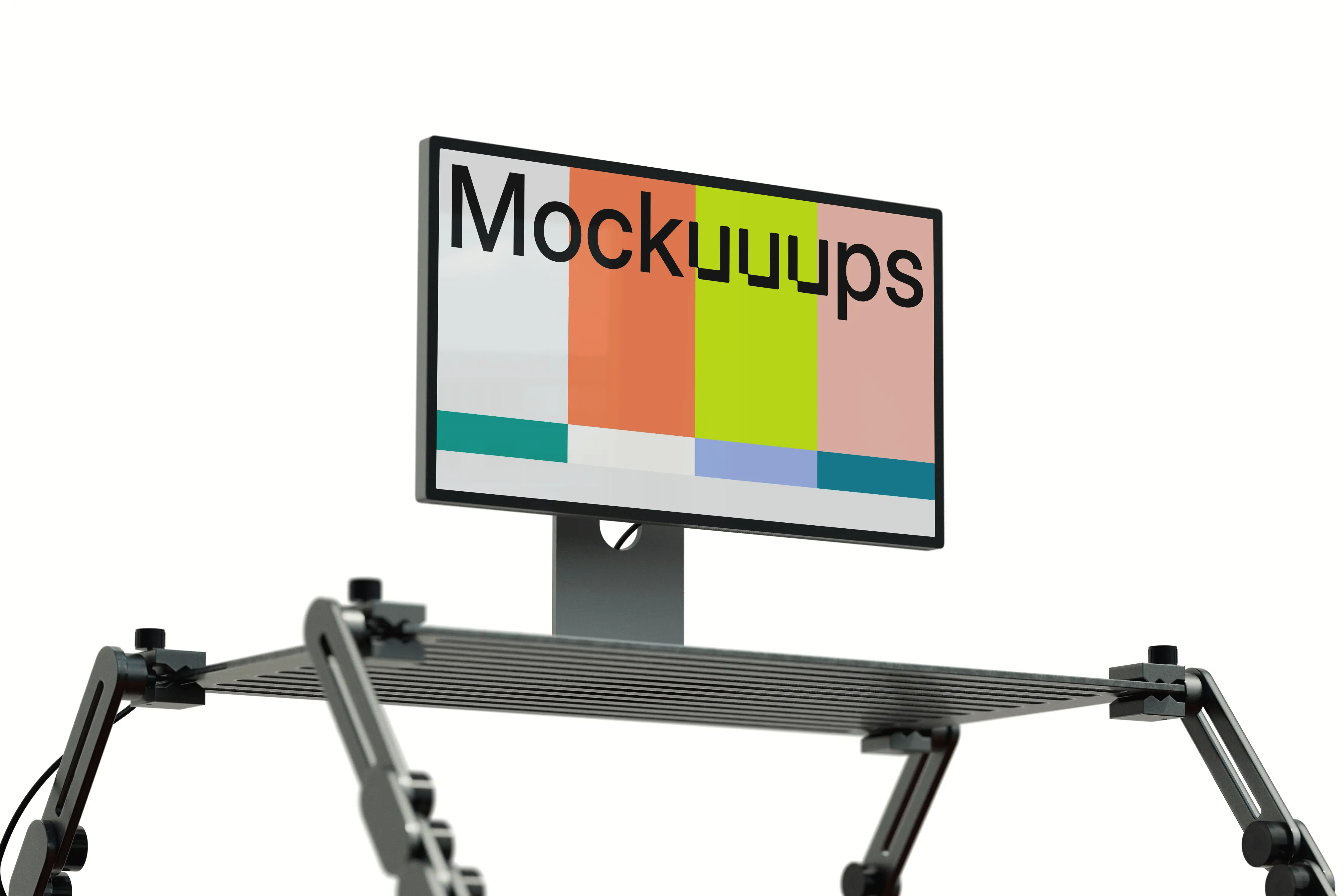 This mockup features an Apple Studio Display mounted on an industrial-style desk stand. The metal stand has a sleek, minimalist design with a grated surface and adjustable mechanisms, exuding a modern, functional aesthetic. The clean white background places full emphasis on the display’s sharp and professional design. Ideal for showcasing your design projects, branding, or app interfaces in a contemporary and practical setting.