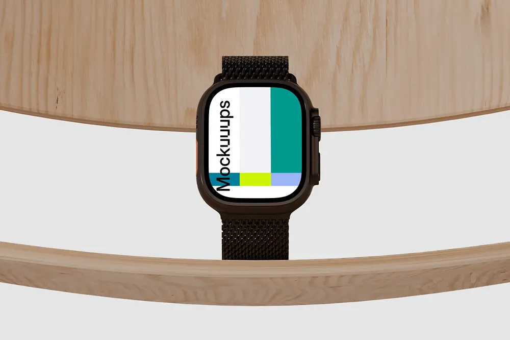 This mockup features an Apple Watch Ultra displayed against a smooth wooden backdrop with a natural finish, highlighting its sleek metal build and woven band. The watch face is positioned upright, allowing a clear showcase of customizable screen content. The curved lines of the wooden element provide a minimalistic yet stylish setting, making this mockup ideal for promoting tech products in a sophisticated and contemporary aesthetic.