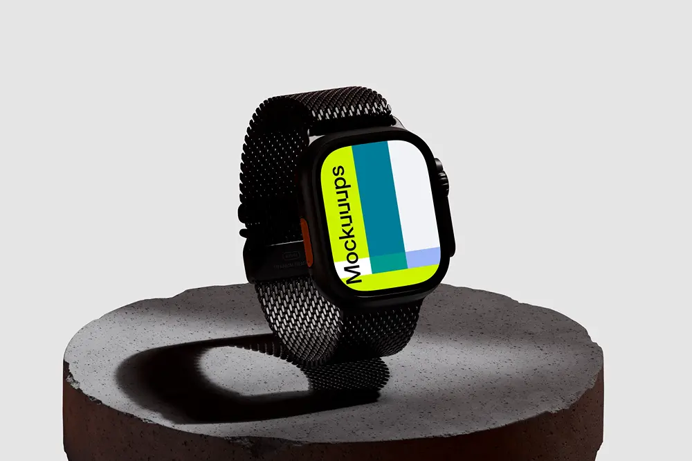An Apple Watch Ultra is prominently displayed on a smooth, dark metal watch band. The watch is placed on a round, gray textured platform, which adds a modern and industrial aesthetic to the composition. The light gray background creates a neutral and clean setting, ensuring the focus remains on the device. This mockup is ideal for showcasing app designs, watch face customization, or other creative content in a professional and stylish context.