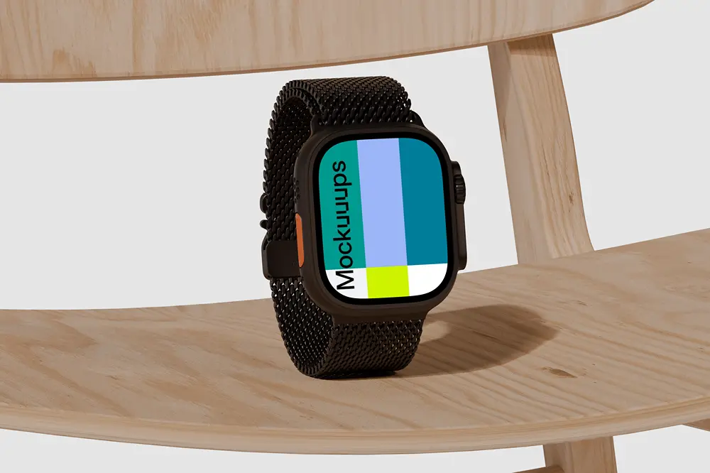 This mockup features an Apple Watch Ultra showcased on a natural wooden chair. The watch, equipped with a sleek black metal mesh strap, is the focal point against the light, neutral wooden surface. The clean and modern single-tone background enhances the product’s sophisticated design. Ideal for showcasing app designs, user interfaces, or branding concepts, this mockup provides a minimalist and functional setting for your content.