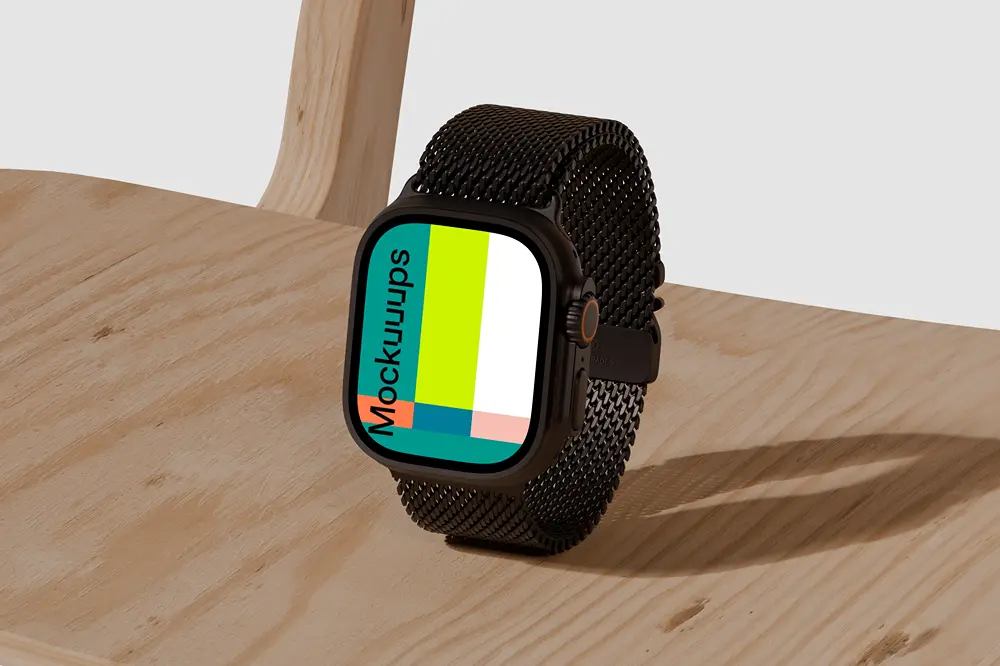This mockup features an Apple Watch Ultra with a sleek black metal band prominently displayed on a natural wooden chair. The watch is angled to showcase its screen, enabling you to place your custom content effortlessly. The neutral background and soft lighting enhance the modern and minimalist aesthetic, making it ideal for showcasing app designs or branding in a clean, professional setting.