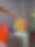 A c-format book with a vibrant gradient cover is featured in this mockup. The book is held by a hand with a minimal moon tattoo, creating a modern and clean aesthetic. The background consists of contemporary stools in orange, green, and grey tones, paired with soft curtain drapes and a touch of greenery. This composition is ideal for presenting book cover designs in a stylish, creative setting, providing ample room for your artwork or branding.