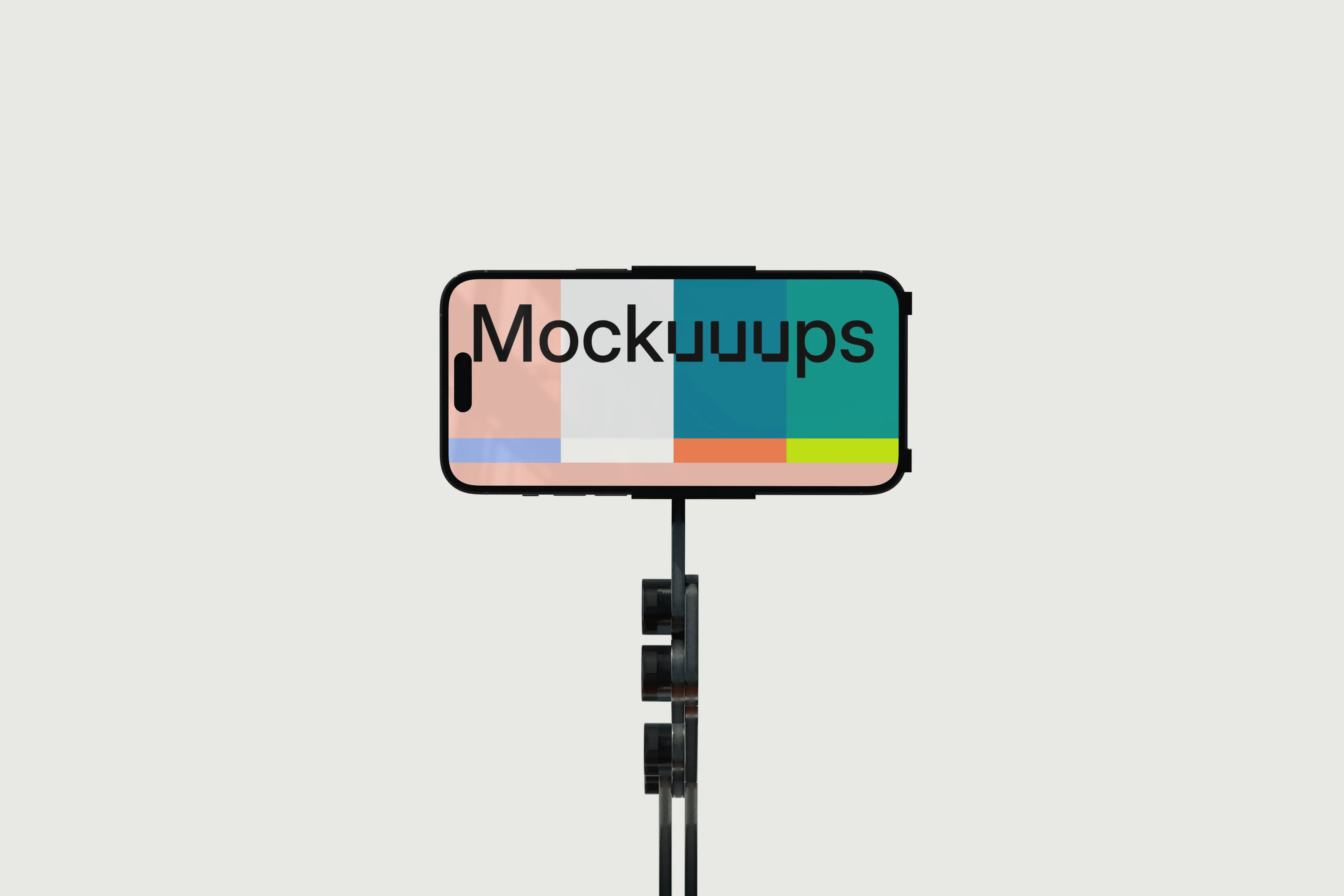 A clean 3D mockup showcasing the iPhone 15 Pro in a horizontal orientation, mounted on a minimalistic adjustable stand against a transparent background. The sleek, monochrome device is positioned prominently, making it ideal for presentation of app designs, website layouts, or promotional content. This mockup emphasizes the phone’s elegant design while providing ample space for showcasing custom graphics on the screen.