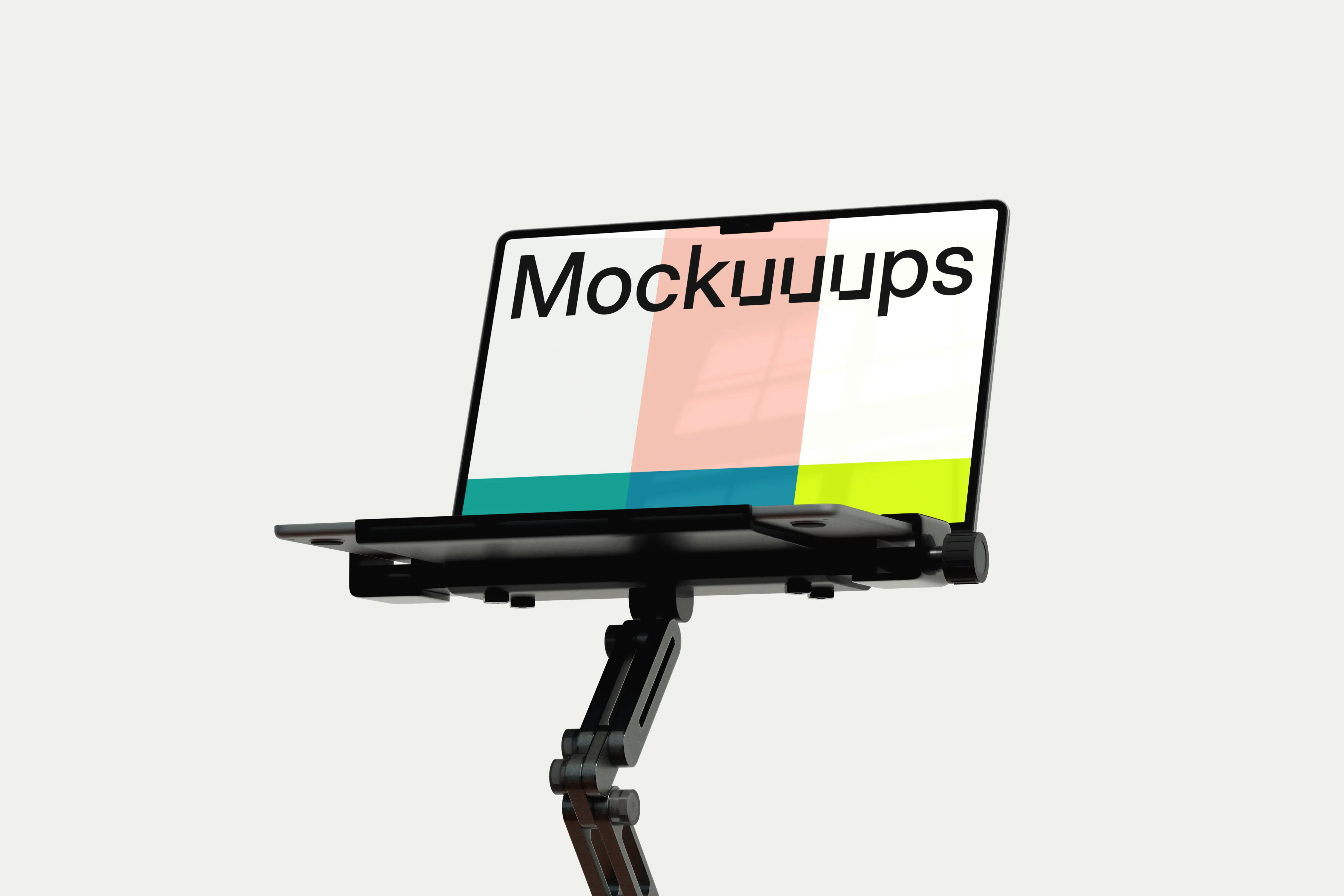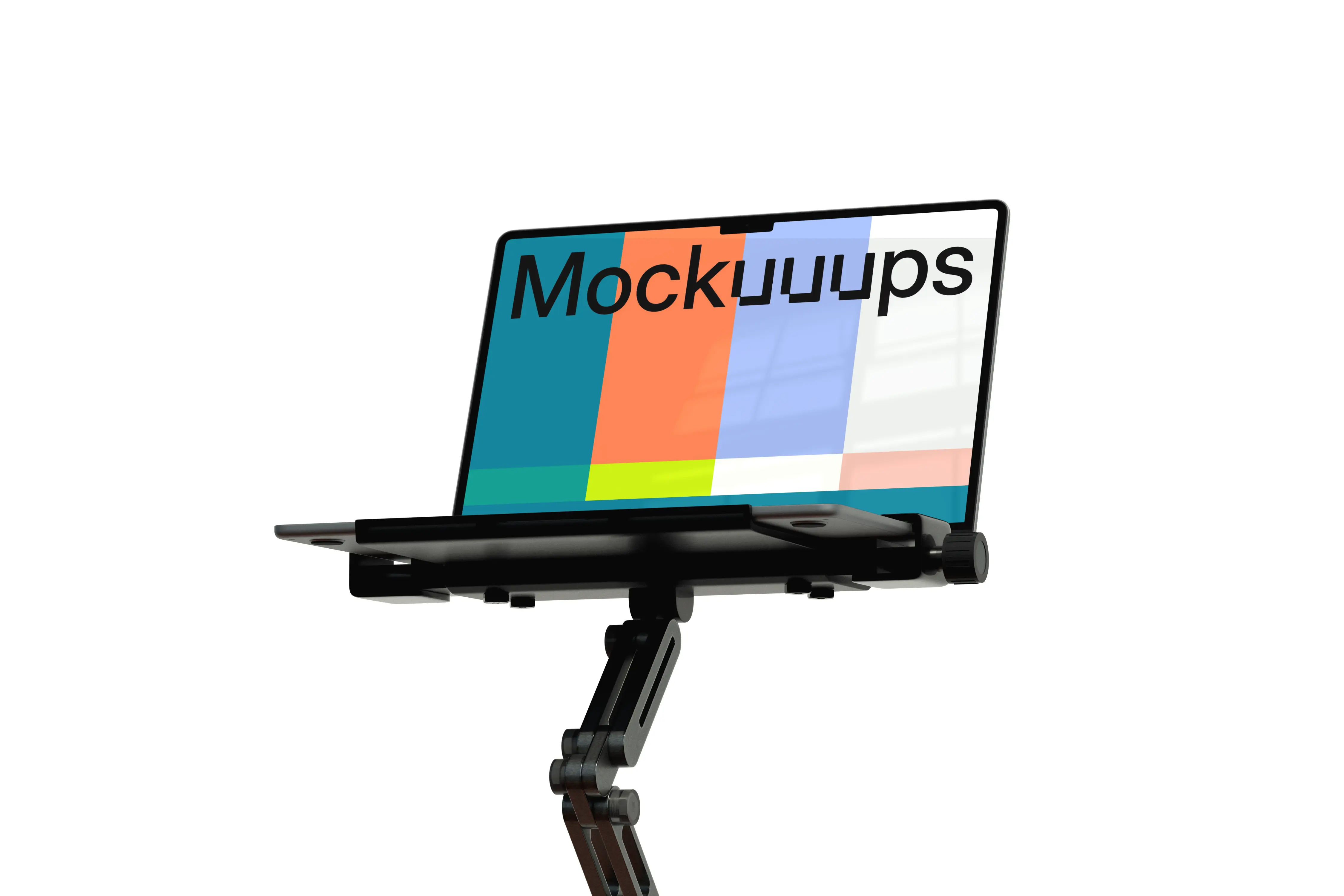 This mockup showcases a 13.3-inch MacBook Air displayed on a modern, adjustable stand, set against a clean transparent background. The sleek design of the laptop is highlighted, making it suitable for presenting app interfaces, website designs, or digital branding materials. The simple and minimalist setup ensures attention remains on the device, providing a professional and versatile template for your creative projects.