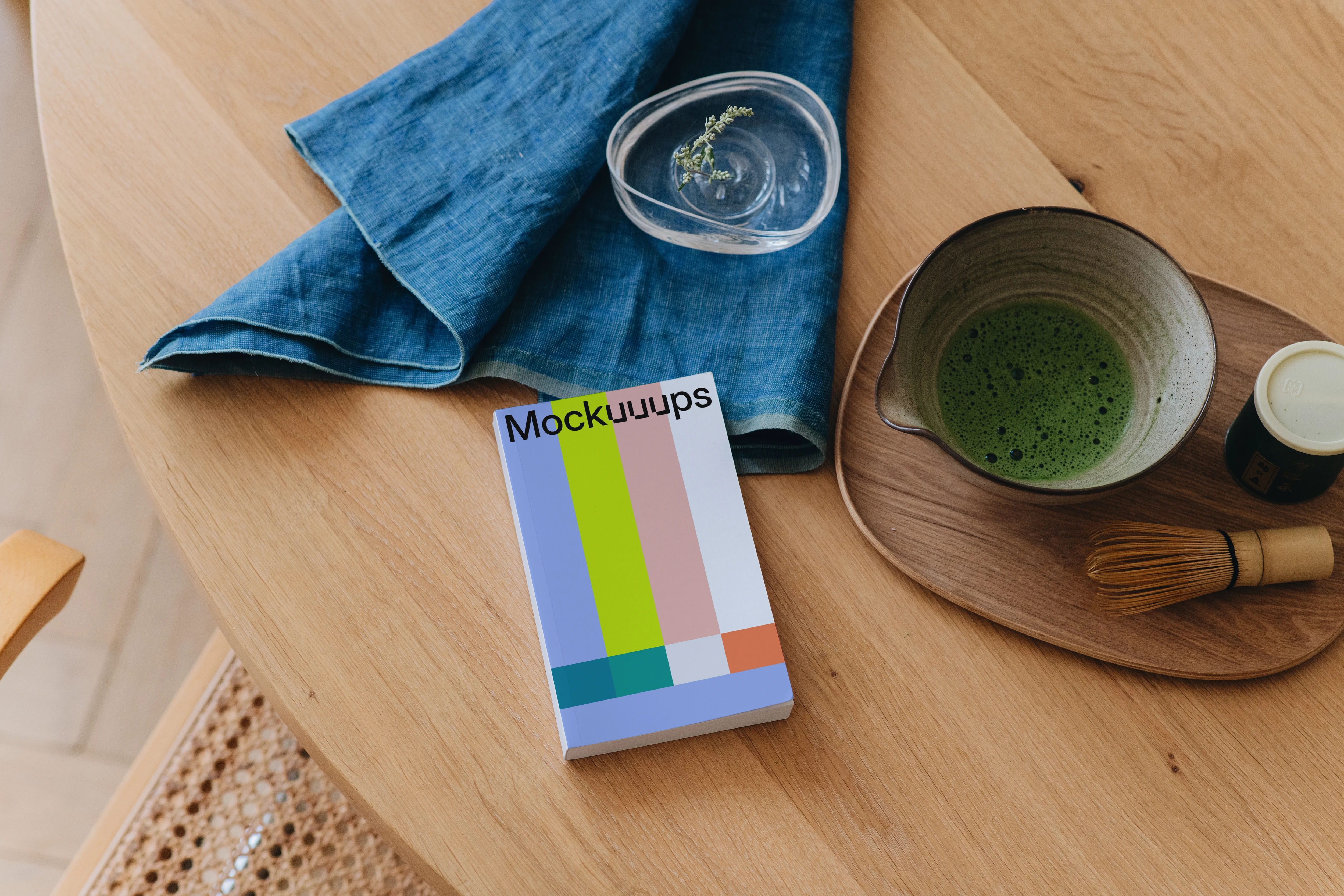 A paperback mockup placed on a natural wood dining table, accompanied by a tea set arranged on a wooden tray. The scene includes a ceramic bowl with matcha tea, a wooden whisk, and a small container. A folded blue fabric napkin and a glass dish with a small plant add a touch of elegance to the setting. This mockup is ideal for showcasing book cover designs in a cozy, minimalist environment.
