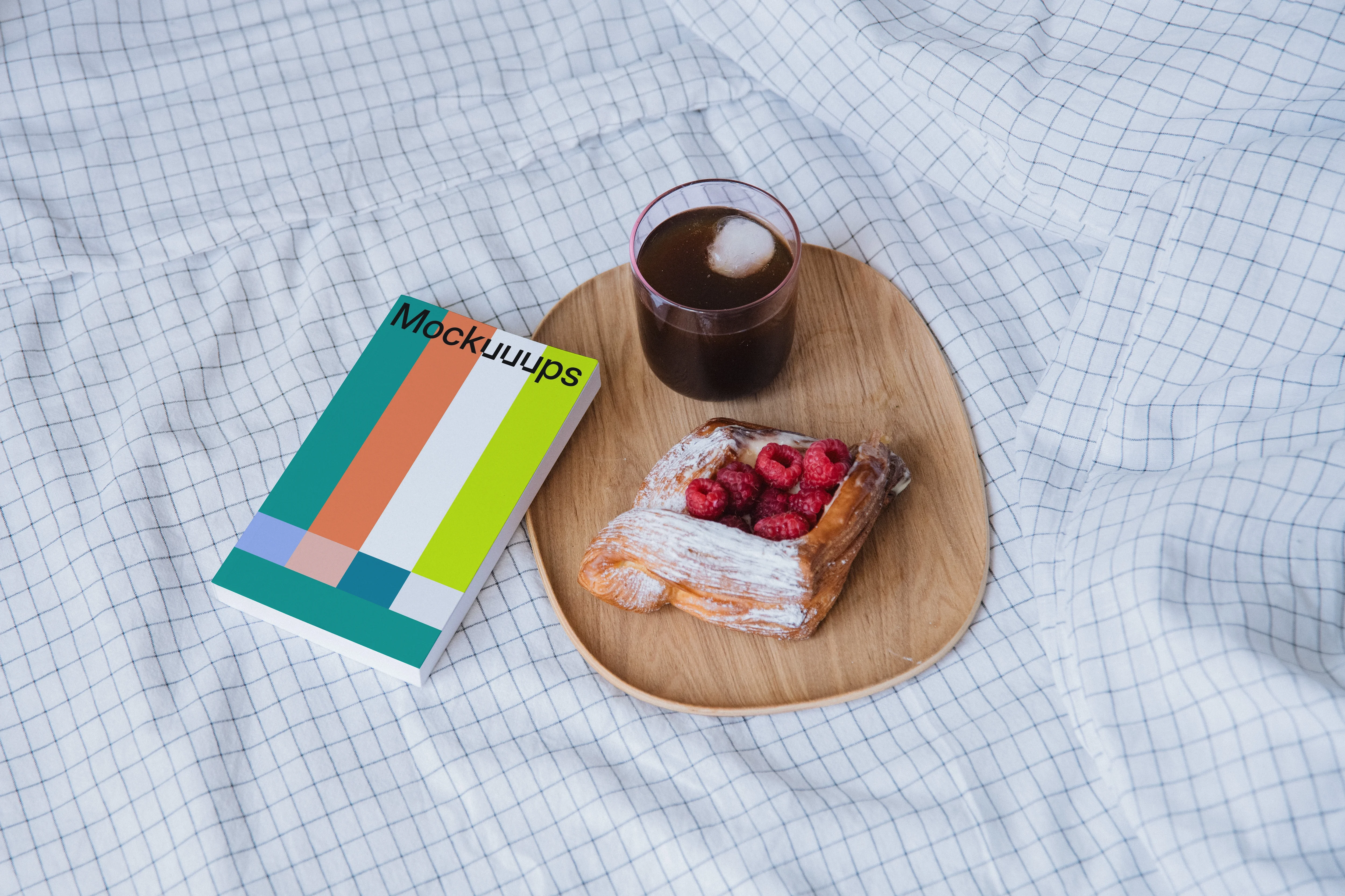 A softcover book mockup placed on a grid-patterned fabric backdrop alongside a wooden tray. The tray holds a glass of iced coffee and a flaky pastry topped with fresh raspberries. The vibrant book cover design adds a modern touch, perfect for showcasing custom artwork or branding. The relaxed and inviting scene makes it ideal for creative presentations or lifestyle promotions, especially related to books or casual morning settings.