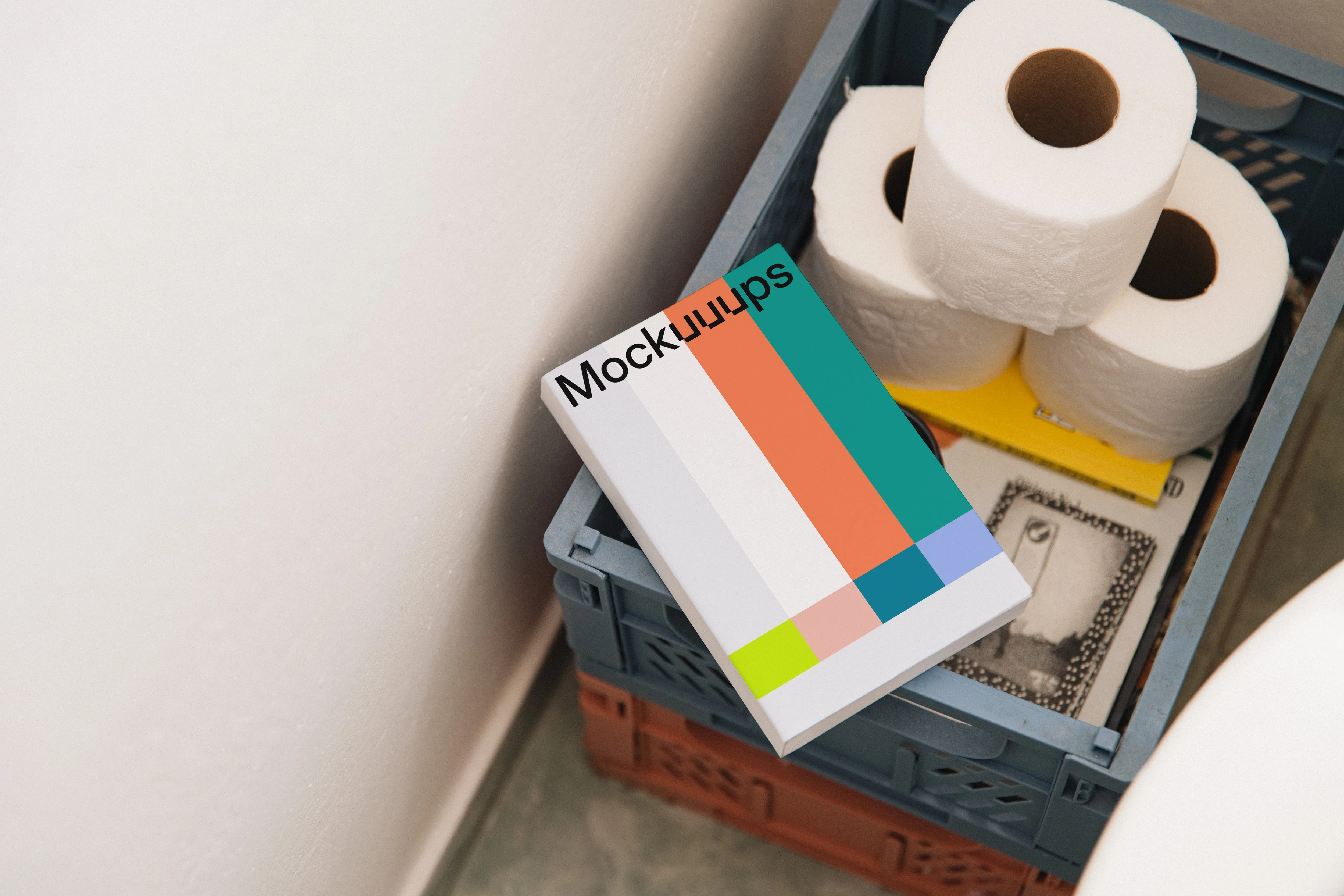 A softcover book mockup displayed on top of a plastic crate in a bathroom setting. The crate holds three rolls of toilet paper and additional miscellaneous items, creating a casual and relatable environment. The book is positioned slightly angled, making it easy to envision a custom design or artwork on its cover. This mockup is ideal for showcasing book covers and designs in a home-utility or minimalist context.