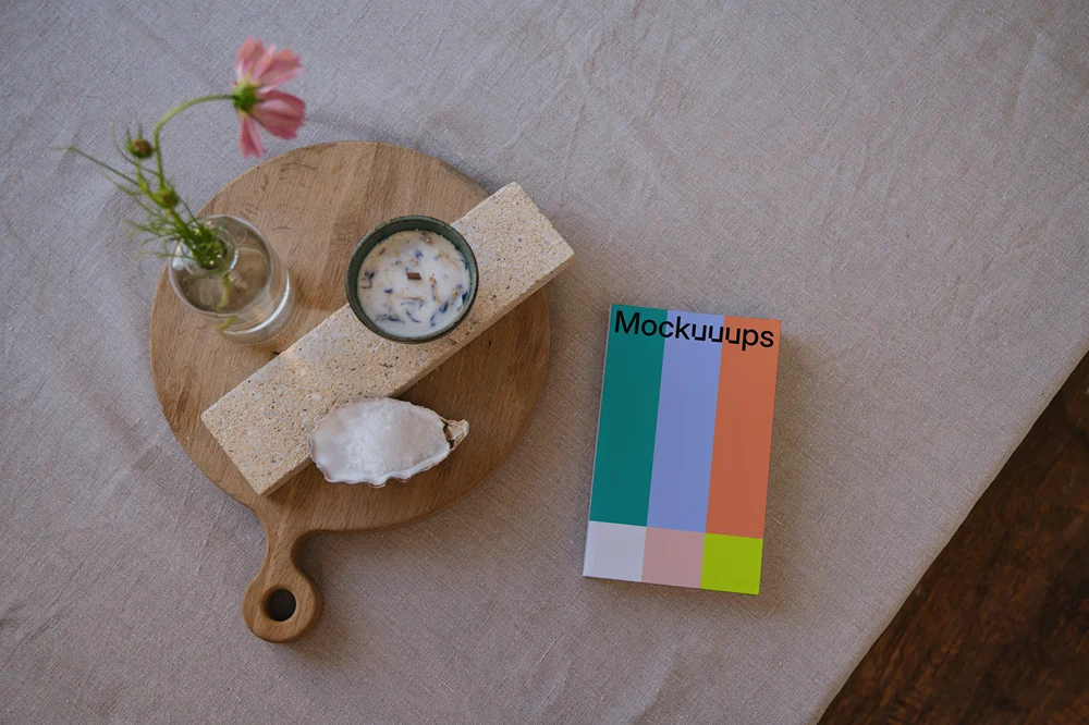 A softcover book mockup is showcased on a neatly arranged setting with a natural feel. The book sits beside a wooden tray holding a delicate floral arrangement in a small glass vase, a textured candle in a ceramic cup, a piece of rustic stone, and an oyster shell. The linen-covered surface and neutral tones create a calming and minimalist atmosphere, ideal for presenting book designs with an artistic or lifestyle theme. Perfect for mockups emphasizing stylish and serene product displays.