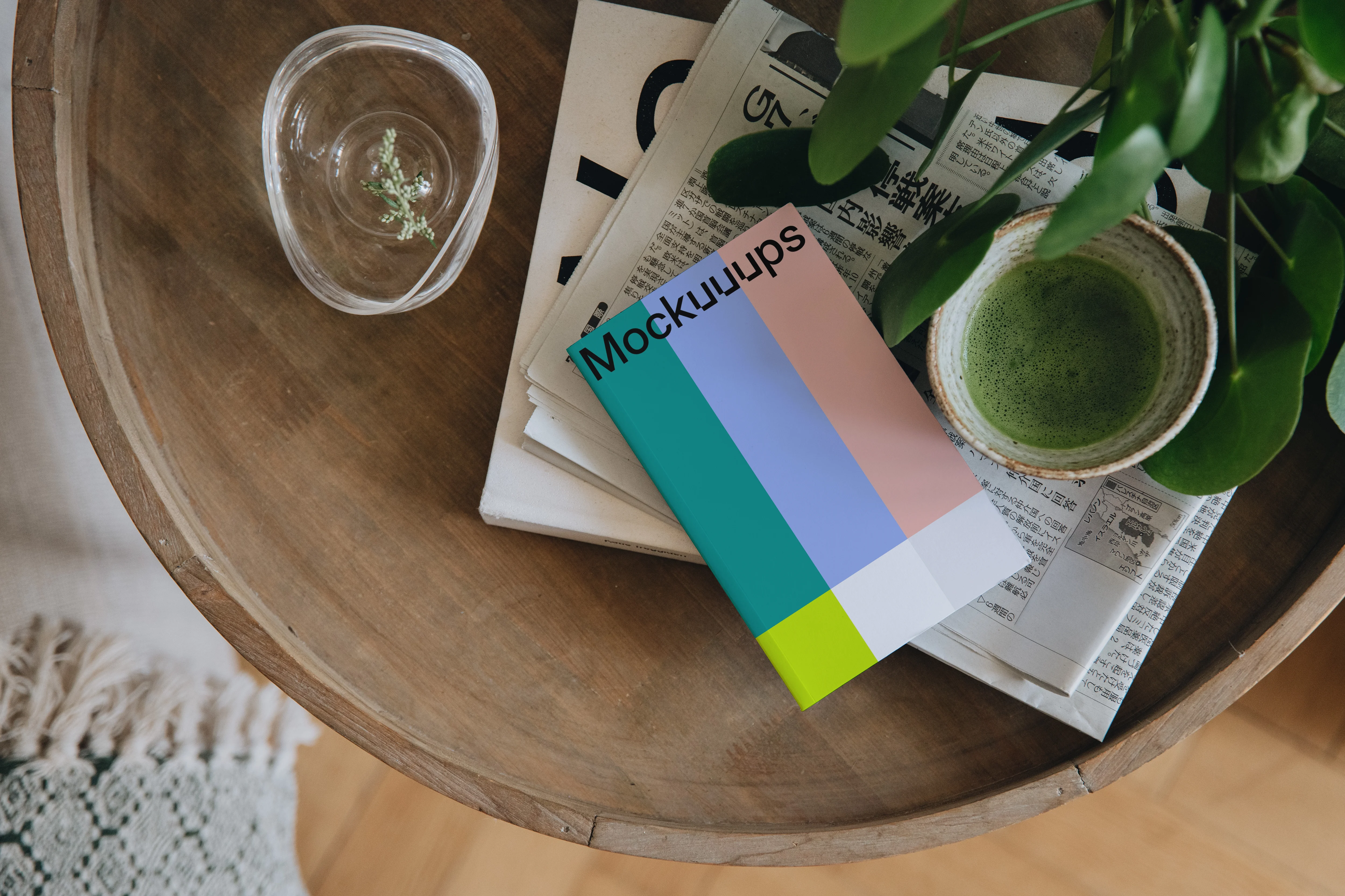 A softcover book mockup displayed on a round wooden table with a cozy setting. The book rests on a stack of newspapers, surrounded by a glass bowl with small greenery and a ceramic cup filled with matcha green tea. A leafy green plant adds a vibrant touch to the scene. The natural lighting and relaxing composition make this mockup perfect for showcasing book cover designs or related creative projects in a serene, home-inspired environment.